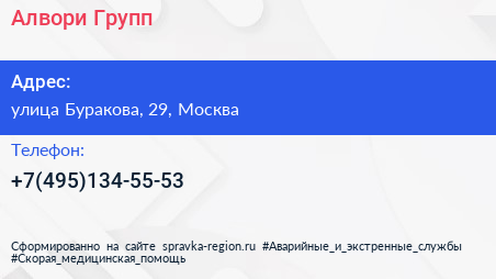 Алвори Групп по адресу улица Буракова, 29, Москва в дальнейшем Организация, размещена в следующих категориях:
