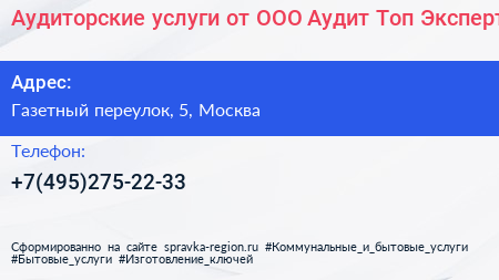 Аудиторские услуги от ООО «Аудит Топ Эксперт» по адресу Газетный переулок, 5, Москва в дальнейшем Организация, размещена в следующих категориях: