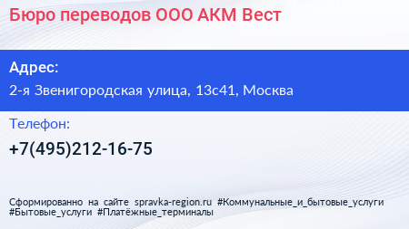 Бюро переводов ООО «АКМ-Вест» по адресу 2-я Звенигородская улица, 13с41, Москва в дальнейшем Организация, размещена в следующих категориях: