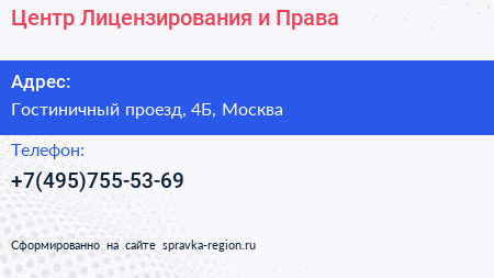 Центр Лицензирования и Права по адресу Гостиничный проезд, 4Б, Москва в дальнейшем Организация, размещена в следующих категориях: