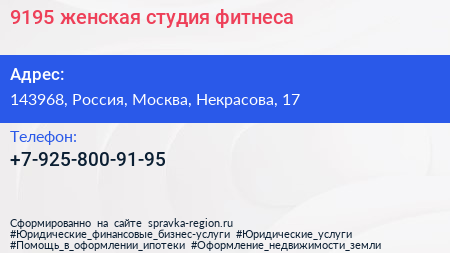 9195, женская студия фитнеса по адресу 143968, Россия, Москва, Некрасова, 17 в дальнейшем Организация, размещена в следующих категориях: