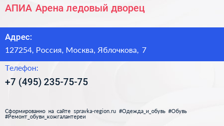 АПИА Арена, ледовый дворец по адресу 127254, Россия, Москва, Яблочкова, 7 в дальнейшем Организация, размещена в следующих категориях: