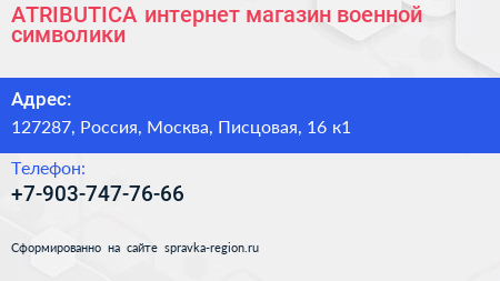 ATRIBUTICA, интернет-магазин военной символики по адресу 127287, Россия, Москва, Писцовая, 16 к1 в дальнейшем Организация, размещена в следующих категориях: