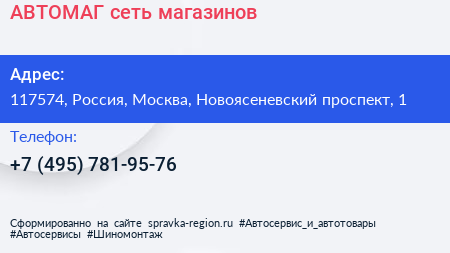 АВТОМАГ, сеть магазинов по адресу 117574, Россия, Москва, Новоясеневский проспект, 1 в дальнейшем Организация, размещена в следующих категориях: