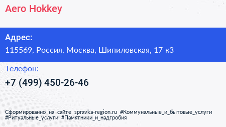 Aero-Hokkey по адресу 115569, Россия, Москва, Шипиловская, 17 к3 в дальнейшем Организация, размещена в следующих категориях: