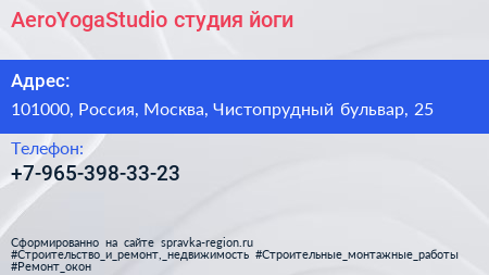 AeroYogaStudio, студия йоги по адресу 101000, Россия, Москва, Чистопрудный бульвар, 25 в дальнейшем Организация, размещена в следующих категориях: