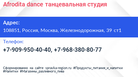 Afrodita dance, танцевальная студия по адресу 108851, Россия, Москва, Железнодорожная, 39 ст1 в дальнейшем Организация, размещена в следующих категориях: