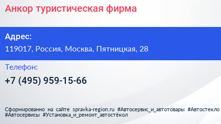 Анкор, туристическая фирма по адресу 119017, Россия, Москва, Пятницкая, 28 в дальнейшем Организация, размещена в следующих категориях: