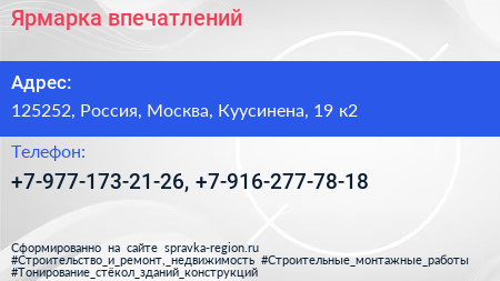 Ярмарка впечатлений по адресу 125252, Россия, Москва, Куусинена, 19 к2 в дальнейшем Организация, размещена в следующих категориях: