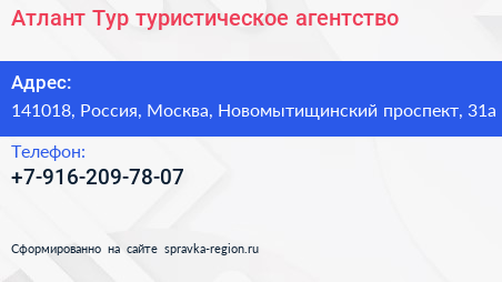 Атлант Тур, туристическое агентство по адресу 141018, Россия, Москва, Новомытищинский проспект, 31а в дальнейшем Организация, размещена в следующих категориях: