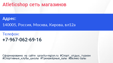 Atleticshop, сеть магазинов по адресу 140005, Россия, Москва, Кирова, вл12а в дальнейшем Организация, размещена в следующих категориях: