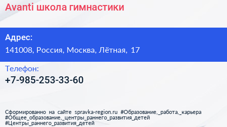 Avanti, школа гимнастики по адресу 141008, Россия, Москва, Лётная, 17 в дальнейшем Организация, размещена в следующих категориях:
