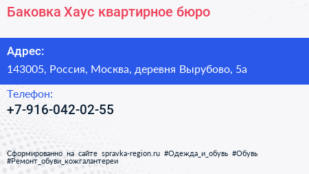 Баковка Хаус, квартирное бюро по адресу 143005, Россия, Москва, деревня Вырубово, 5а в дальнейшем Организация, размещена в следующих категориях: