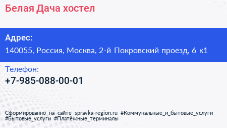 Белая Дача, хостел по адресу 140055, Россия, Москва, 2-й Покровский проезд, 6 к1 в дальнейшем Организация, размещена в следующих категориях:
