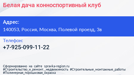 Белая дача, конноспортивный клуб по адресу 140053, Россия, Москва, Полевой проезд, 3в в дальнейшем Организация, размещена в следующих категориях: