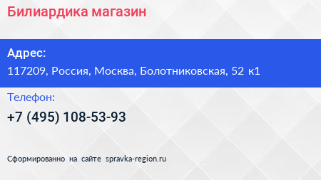 Билиардика, магазин по адресу 117209, Россия, Москва, Болотниковская, 52 к1 в дальнейшем Организация, размещена в следующих категориях: