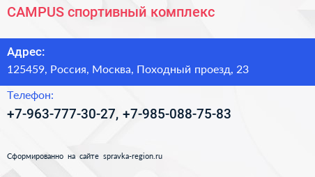 CAMPUS, спортивный комплекс по адресу 125459, Россия, Москва, Походный проезд, 23 в дальнейшем Организация, размещена в следующих категориях: