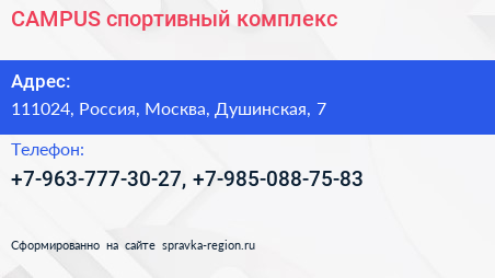 CAMPUS, спортивный комплекс по адресу 111024, Россия, Москва, Душинская, 7 в дальнейшем Организация, размещена в следующих категориях: