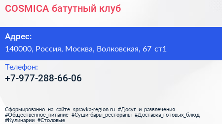 COSMICA, батутный клуб по адресу 140000, Россия, Москва, Волковская, 67 ст1 в дальнейшем Организация, размещена в следующих категориях: