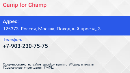 Camp for Champ по адресу 125373, Россия, Москва, Походный проезд, 3 в дальнейшем Организация, размещена в следующих категориях: