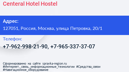 Centeral Hotel & Hostel по адресу 127051, Россия, Москва, улица Петровка, 20/1 в дальнейшем Организация, размещена в следующих категориях: