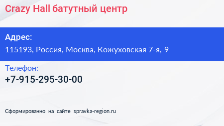 Crazy Hall, батутный центр по адресу 115193, Россия, Москва, Кожуховская 7-я, 9 в дальнейшем Организация, размещена в следующих категориях: