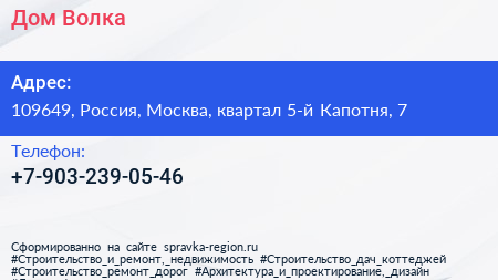 Дом Волка по адресу 109649, Россия, Москва, квартал 5-й Капотня, 7 в дальнейшем Организация, размещена в следующих категориях: