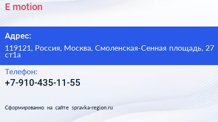 E-motion по адресу 119121, Россия, Москва, Смоленская-Сенная площадь, 27 ст1а в дальнейшем Организация, размещена в следующих категориях: