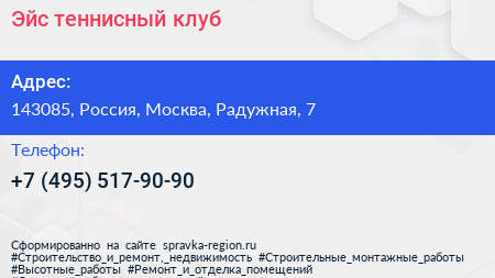 Эйс, теннисный клуб по адресу 143085, Россия, Москва, Радужная, 7 в дальнейшем Организация, размещена в следующих категориях:
