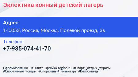 Эклектика, конный детский лагерь по адресу 140053, Россия, Москва, Полевой проезд, 3в в дальнейшем Организация, размещена в следующих категориях: