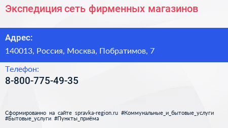Экспедиция, сеть фирменных магазинов по адресу 140013, Россия, Москва, Побратимов, 7 в дальнейшем Организация, размещена в следующих категориях: