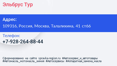 Эльбрус-Тур по адресу 109316, Россия, Москва, Талалихина, 41 ст66 в дальнейшем Организация, размещена в следующих категориях: