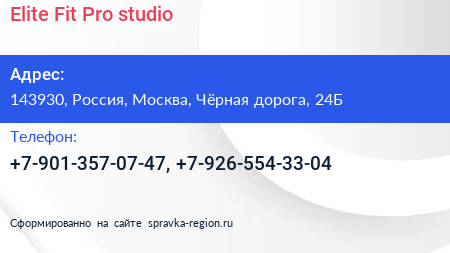 Elite Fit Pro studio по адресу 143930, Россия, Москва, Чёрная дорога, 24Б в дальнейшем Организация, размещена в следующих категориях: