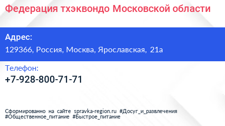 Федерация тхэквондо Московской области по адресу 129366, Россия, Москва, Ярославская, 21а в дальнейшем Организация, размещена в следующих категориях: