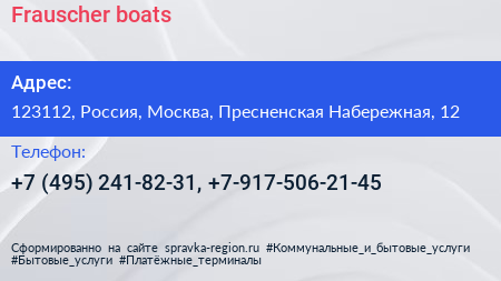 Frauscher boats по адресу 123112, Россия, Москва, Пресненская Набережная, 12 в дальнейшем Организация, размещена в следующих категориях: