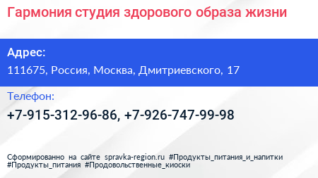 Гармония, студия здорового образа жизни по адресу 111675, Россия, Москва, Дмитриевского, 17 в дальнейшем Организация, размещена в следующих категориях:
