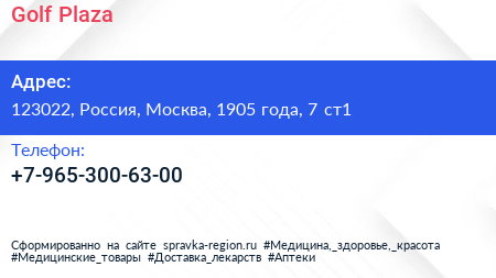 Golf Plaza по адресу 123022, Россия, Москва, 1905 года, 7 ст1 в дальнейшем Организация, размещена в следующих категориях: