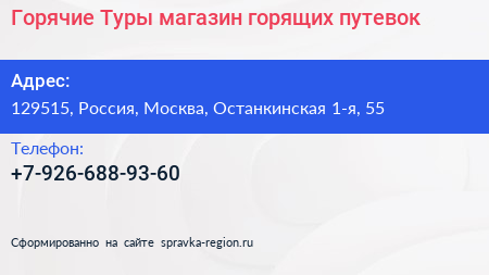 Горячие Туры, магазин горящих путевок по адресу 129515, Россия, Москва, Останкинская 1-я, 55 в дальнейшем Организация, размещена в следующих категориях: