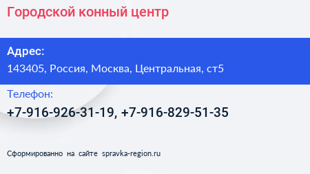 Городской конный центр по адресу 143405, Россия, Москва, Центральная, ст5 в дальнейшем Организация, размещена в следующих категориях: