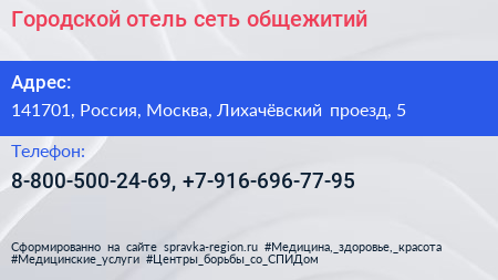 Городской отель, сеть общежитий по адресу 141701, Россия, Москва, Лихачёвский проезд, 5 в дальнейшем Организация, размещена в следующих категориях: