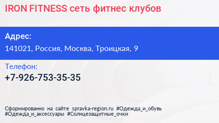 IRON FITNESS, сеть фитнес-клубов по адресу 141021, Россия, Москва, Троицкая, 9 в дальнейшем Организация, размещена в следующих категориях: