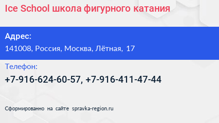 Ice School, школа фигурного катания по адресу 141008, Россия, Москва, Лётная, 17 в дальнейшем Организация, размещена в следующих категориях: