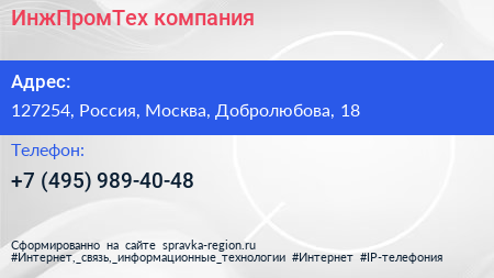 ИнжПромТех, компания по адресу 127254, Россия, Москва, Добролюбова, 18 в дальнейшем Организация, размещена в следующих категориях: