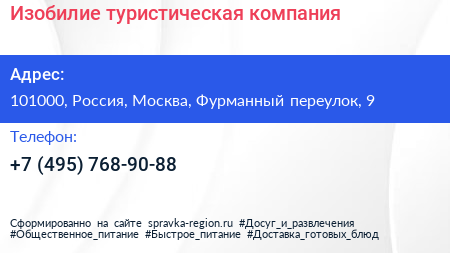 Изобилие, туристическая компания по адресу 101000, Россия, Москва, Фурманный переулок, 9 в дальнейшем Организация, размещена в следующих категориях: