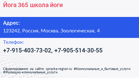 Йога 365, школа йоги по адресу 123242, Россия, Москва, Зоологическая, 4 в дальнейшем Организация, размещена в следующих категориях: