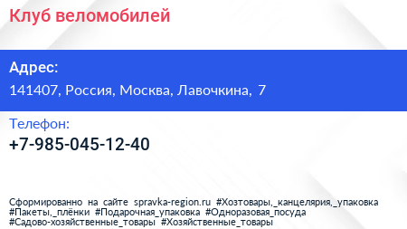 Клуб веломобилей по адресу 141407, Россия, Москва, Лавочкина, 7 в дальнейшем Организация, размещена в следующих категориях:
