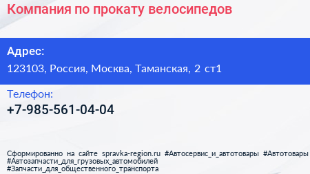 Компания по прокату велосипедов по адресу 123103, Россия, Москва, Таманская, 2 ст1 в дальнейшем Организация, размещена в следующих категориях:
