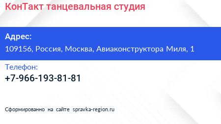 КонТакт, танцевальная студия по адресу 109156, Россия, Москва, Авиаконструктора Миля, 1 в дальнейшем Организация, размещена в следующих категориях: