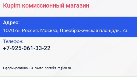 Kupim, комиссионный магазин по адресу 107076, Россия, Москва, Преображенская площадь, 7а в дальнейшем Организация, размещена в следующих категориях: