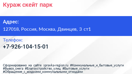 Кураж, скейт-парк по адресу 127018, Россия, Москва, Двинцев, 3 ст1 в дальнейшем Организация, размещена в следующих категориях: